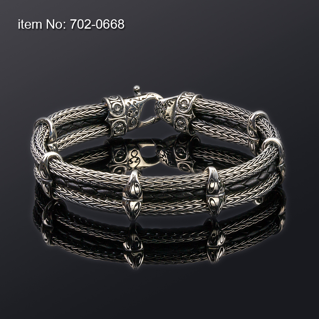 Ασημένιο βραχιόλι με μοτίφ (14mm φάρδος) και με γνήσιο μαύρο δέρμα