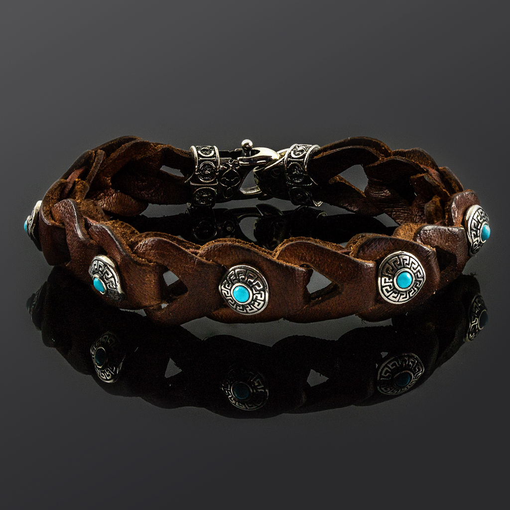 Ασημένιο βραχιόλι με μαίανδρο μοτιφ και τυρκουάζ πέτρα, με γνήσιο πλεκτό δέρμα