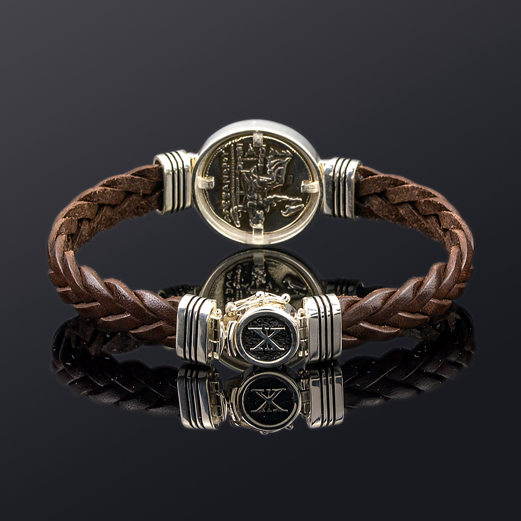 Ασημένιο Βραχιόλι 925° με μοτίβο νόμισμα Μ. Αλέξανδρος 22mm και γνήσιο πλεκτό καφέ δέρμα 10mm