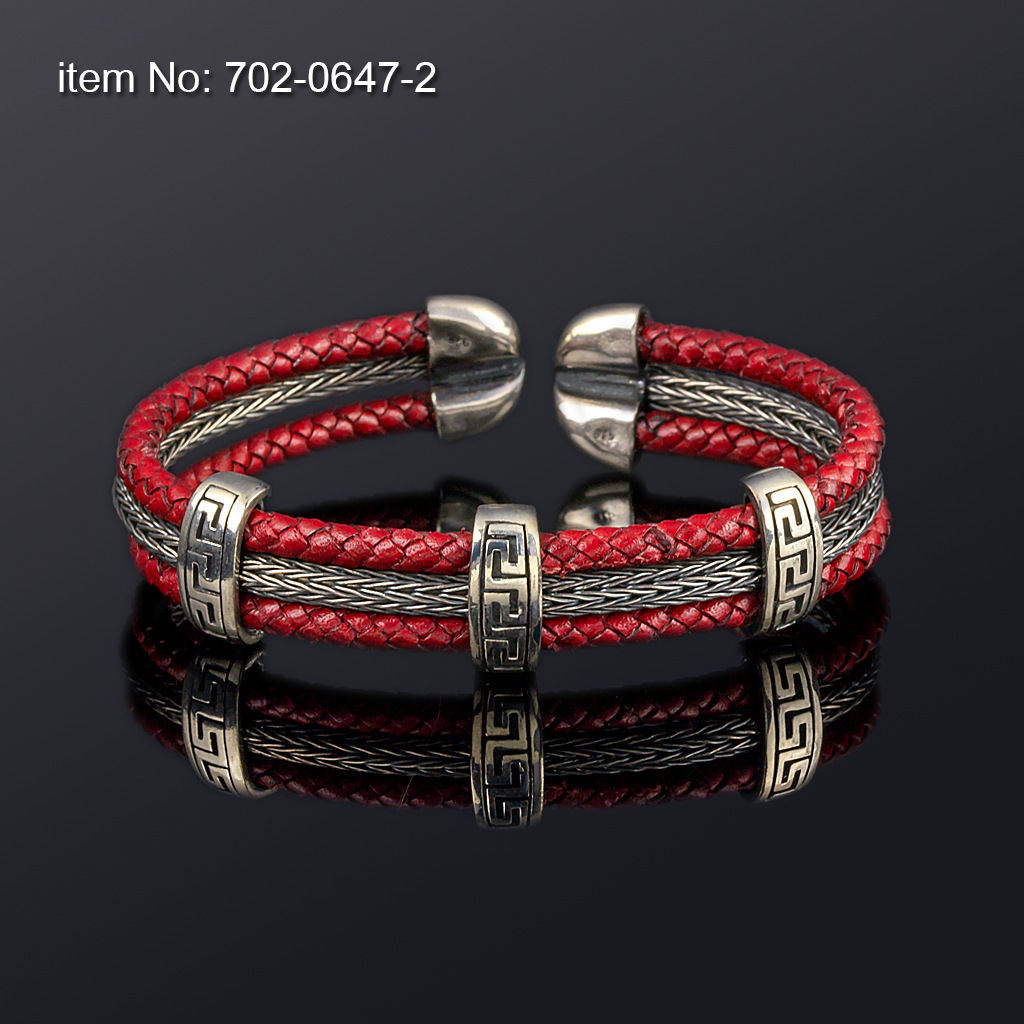 Ασημένιο flex βραχιόλι με μοτιφ (12 mm φάρδος), και με γνήσιο καφέ δέρμα